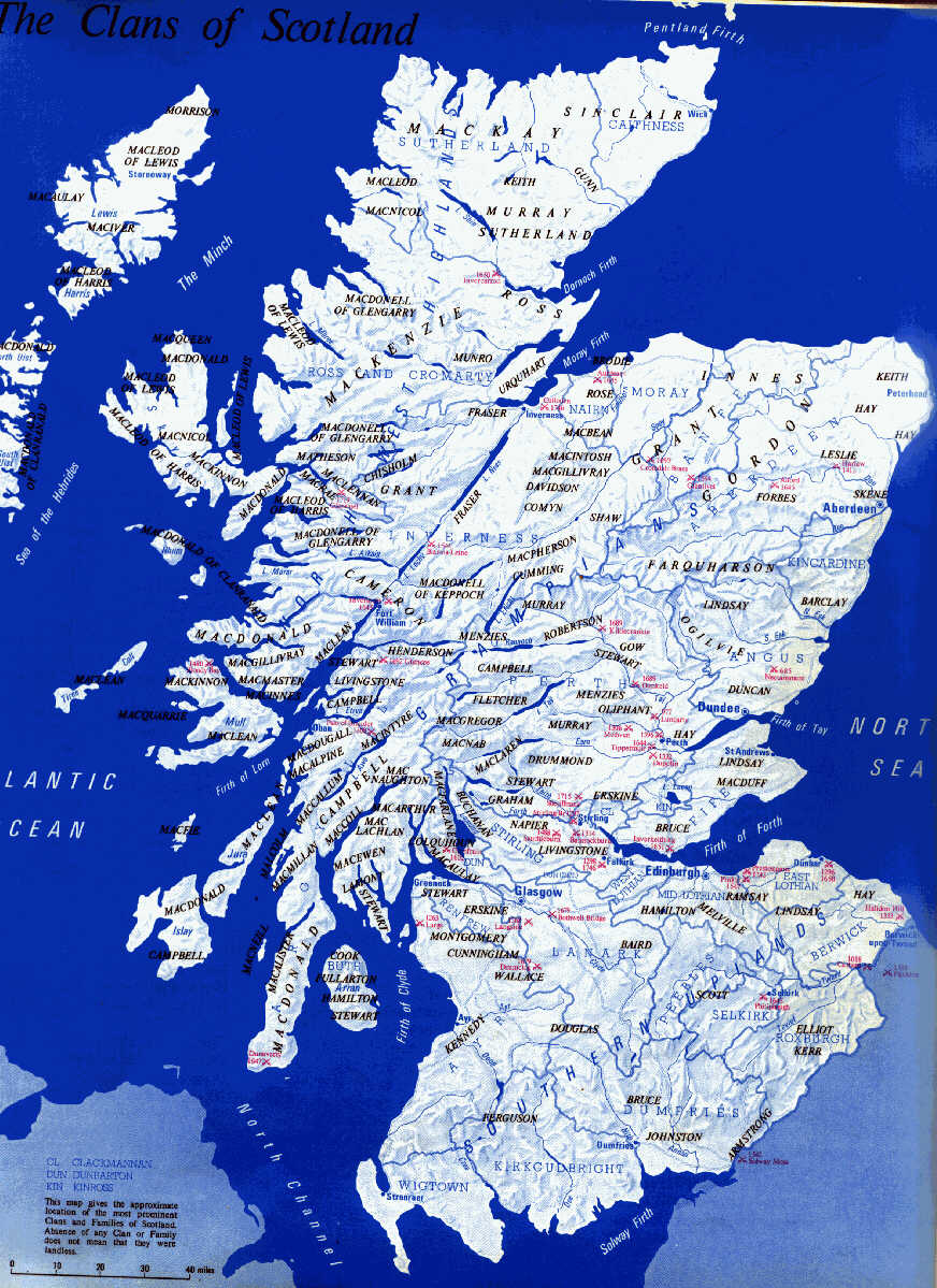 I'm not sure what the source is on this map anymore (bad notes), but I had saved it with the express purpose of offering it for reference here at one time in the past. It's interesting because it shows the family names for the various Scottish Clans and their locations across Scotland.