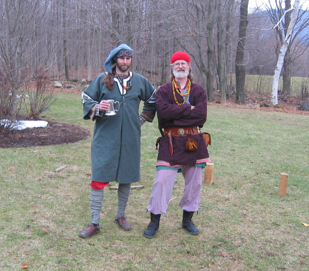 After we had gotten our table set up with celtic designed woven rugs, and wall hangings and set out the games and the bauble boxes and such I was called to play a game of Kubb (pronounced KOOB), a Nordic wood throwing game which is sort of a cross between horseshoes and Fitchneal (Tafl or 'table' to the Vikings).It was about this time that Gobae showed up!I picked up two beautiful knives from him (I had commissioned him for a reproduction of an archaeological knife find and he was kind enough to run it up to the event for me, though he couldn't hang for too long). Turns out Gobae is not only a master smith (who has great word fame in Norseland as I gathered from all the talk about him later on), but a musician as well and read a piece out of the book of song on my guitar lute quite competently! The Kubb game continued, and my team-mate Hobbe and I managed to win one round, but lost to Grey and Tomas. After warming my hands up inside for a bit, I decided that I had wood chucked all I would be chucking and Tanner took my place for a final round where they finished 2nd place.I'm told Tanner didn't need the 2nd place prize, which just happened to be an awesome scabbard made by Raffen (who has some word fame of his own in leather-craft), which I was not too proud to accept even though the win was really Hobbe and Tanners'.