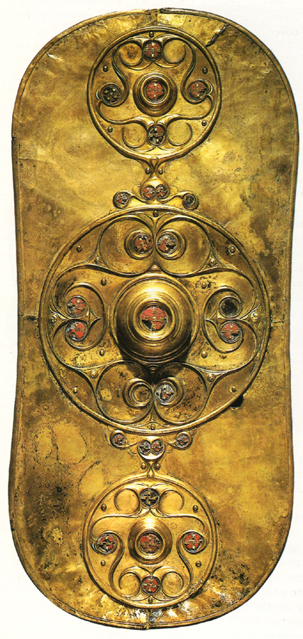 The Battersea shield is a decorative sheet bronze shield probably dating to before the first century AD. Found in the River Thames in the UK, it is decorated with repoussé decoration and enamel. The decoration is typically Celtic in terms of art style consisting of circles and spirals. It may not have been used in battle, but was probably created as an offering to the Celtic river spirits.