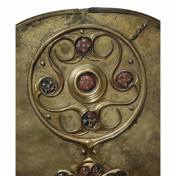 The Battersea shield is a decorative sheet bronze shield probably dating to before the first century AD. Found in the River Thames in the UK, it is decorated with repoussé decoration and enamel. The decoration is typically Celtic in terms of art style consisting of circles and spirals. It may not have been used in battle, but was probably created as an offering to the Celtic river spirits.