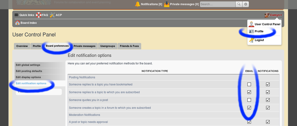 The first thing to do is set up your profile and select what type of activities will trigger an email. This is done in the User Control Panel (UCP). You can access the UCP by clicking on your username at upper right and selecting UCP or Profile. Then click on the Board Preferences tab, then select "Edit notification options" and make selections in the Email column as desired. The two selections for "Subscriptions" are the critical ones you need.