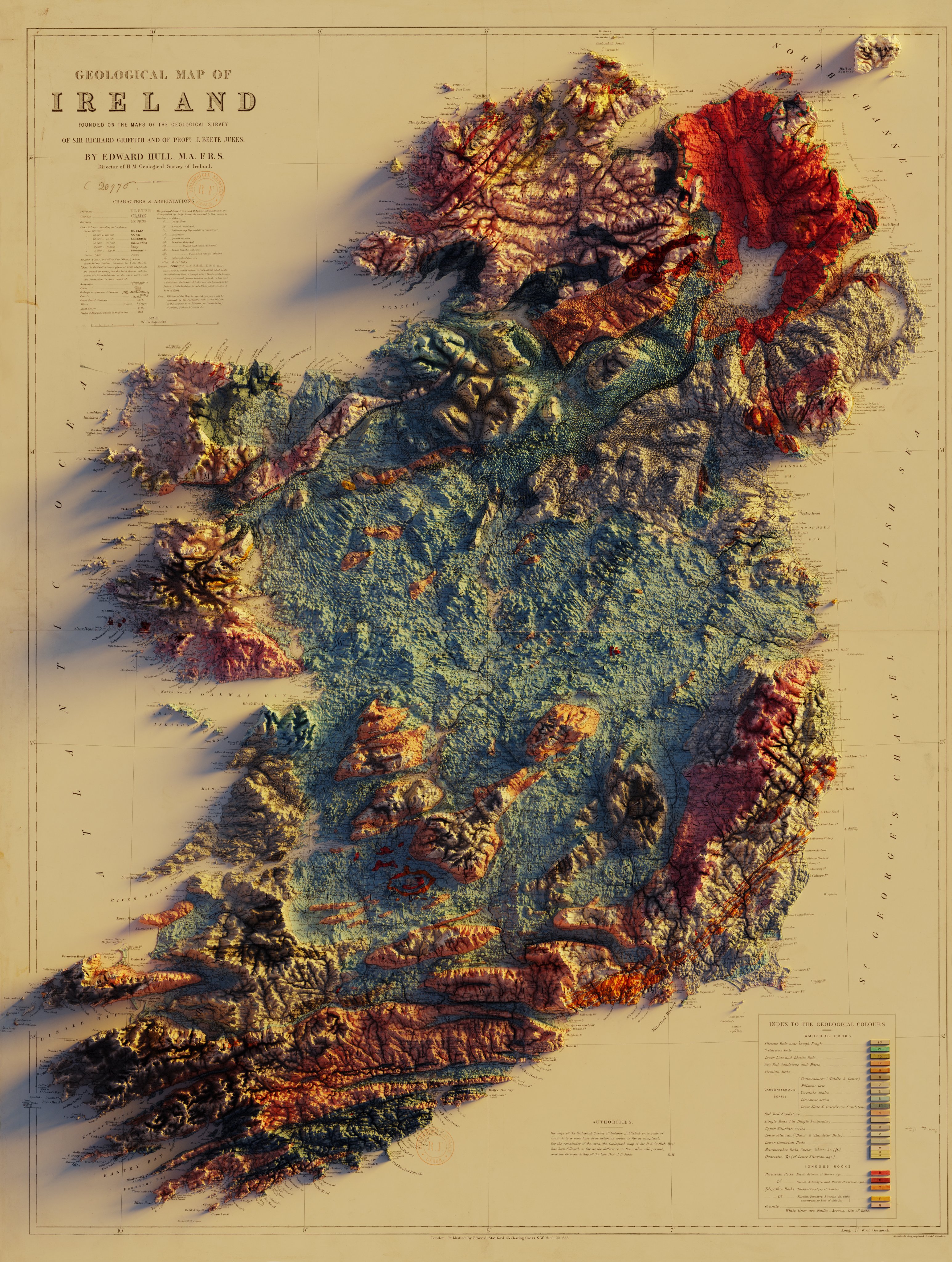 Geological map of Ireland founded on the maps of the Geological Survey of Sir Richard Griffith and of Profr. J. Beete Jukes / by Edward Hull,M.A. F.R.S - 1878